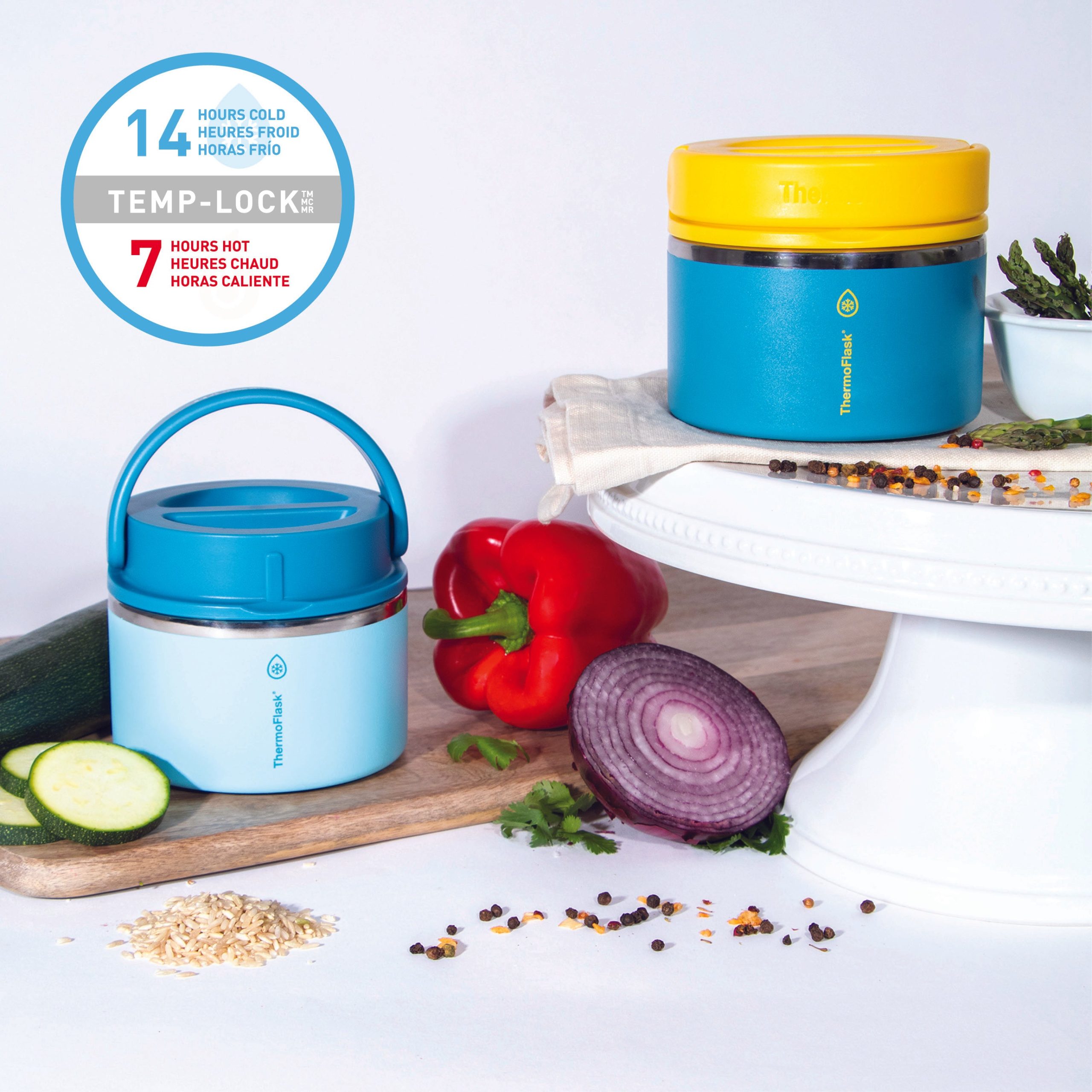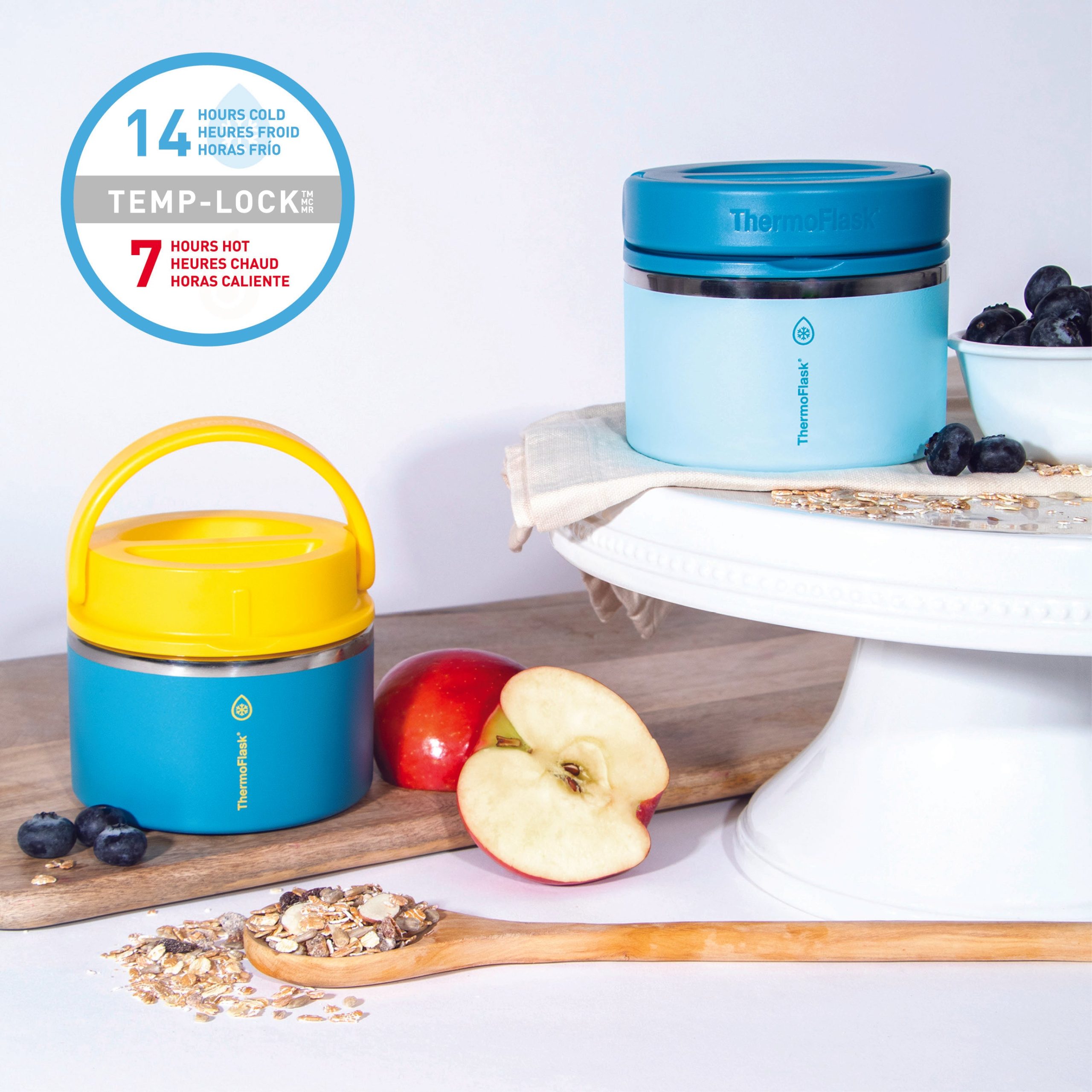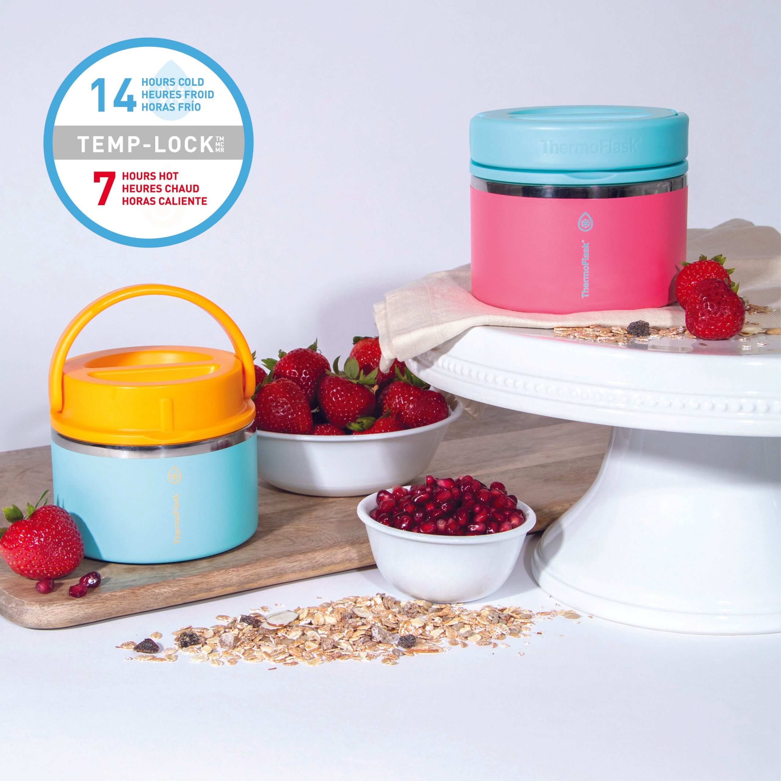 The ThermoFlask Food Jar keeps food hot or cold all day long with Temp-Lock™ technology. Perfect for everything from packing a warm lunch to keeping fruit cool and fresh during outdoor activities. it’s an essential upgrade from conventional food storage. The lid of the jar screws on to form a leak-proof seal so it’s lunch box safe. and boasts an easy grip handle. making it convenient to take anywhere.