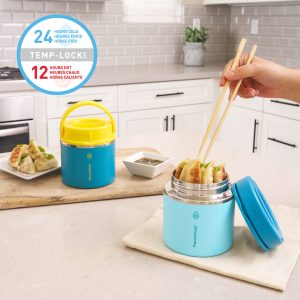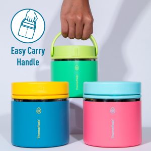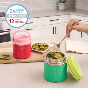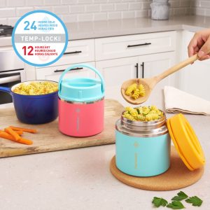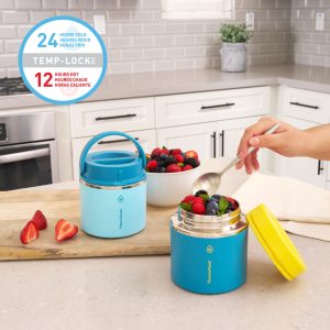The ThermoFlask Food Jar keeps food hot or cold all day long with Temp-Lock™ technology. Perfect for everything from packing a warm lunch to keeping fruit cool and fresh during outdoor activities. it’s an essential upgrade from conventional food storage. The lid of the jar screws on to form a leak-proof seal so it’s lunch box safe. and boasts an easy grip handle. making it convenient to take anywhere.