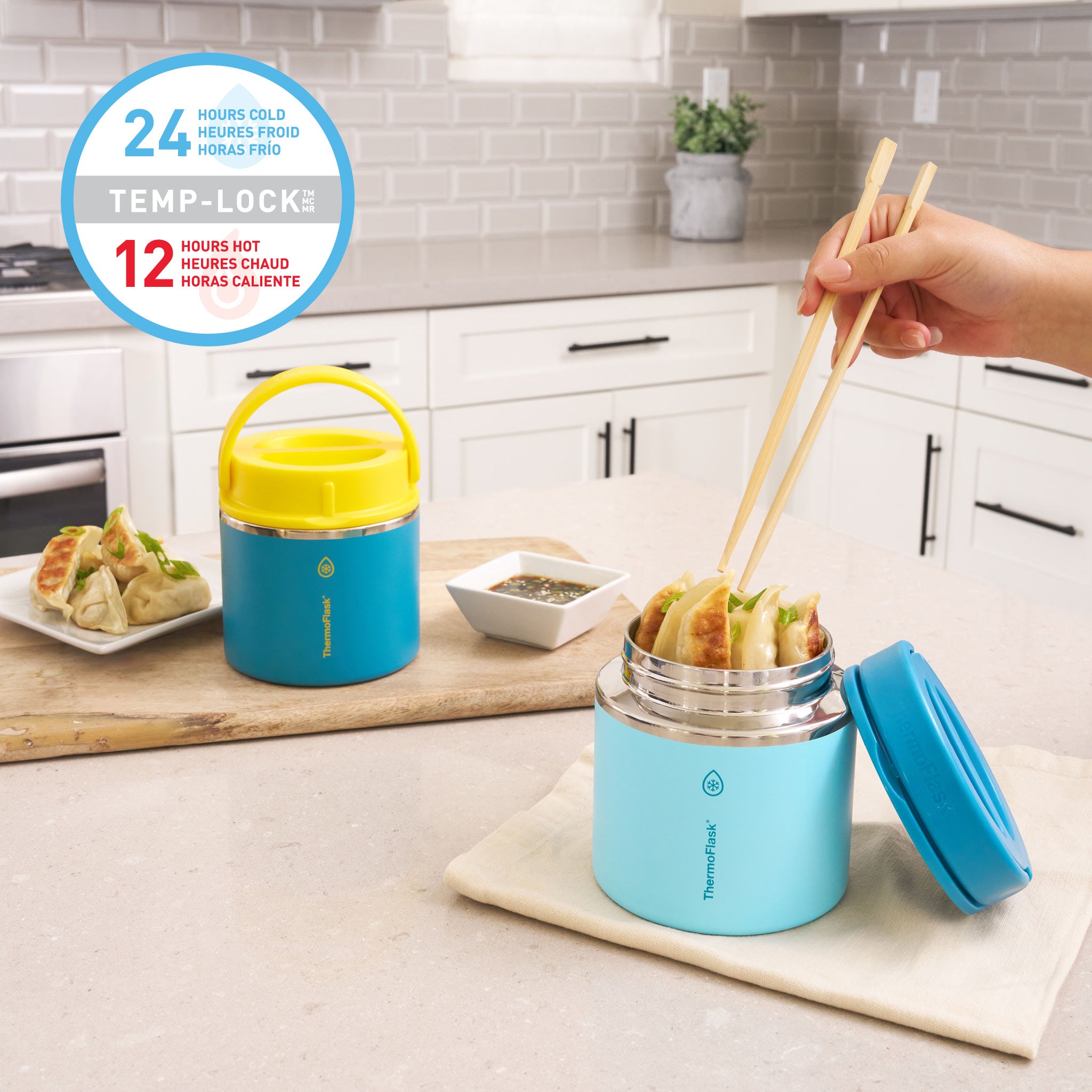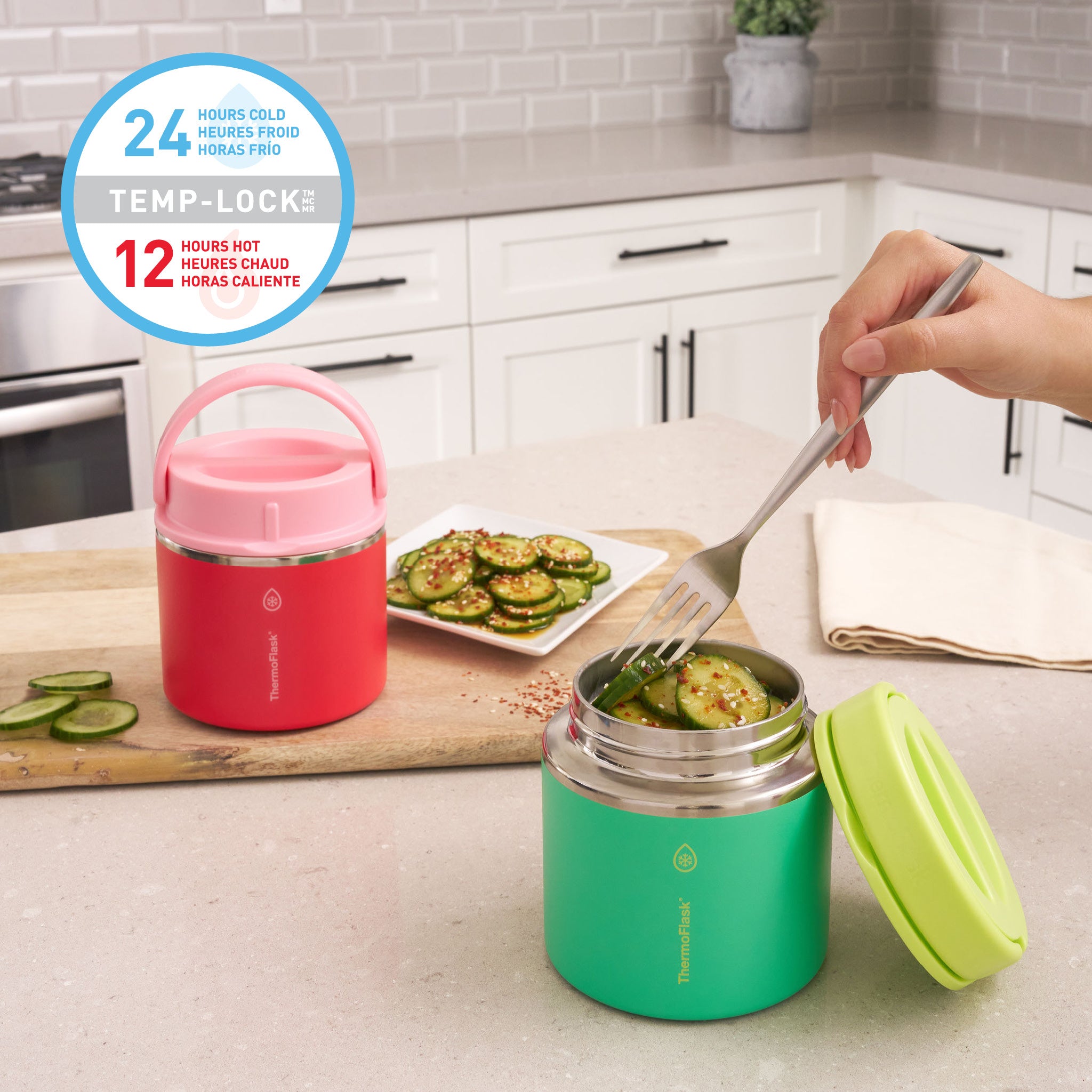 The ThermoFlask Food Jar keeps food hot or cold all day long with Temp-Lock™ technology. Perfect for everything from packing a warm lunch to keeping fruit cool and fresh during outdoor activities. it’s an essential upgrade from conventional food storage. The lid of the jar screws on to form a leak-proof seal so it’s lunch box safe. and boasts an easy grip handle. making it convenient to take anywhere.
