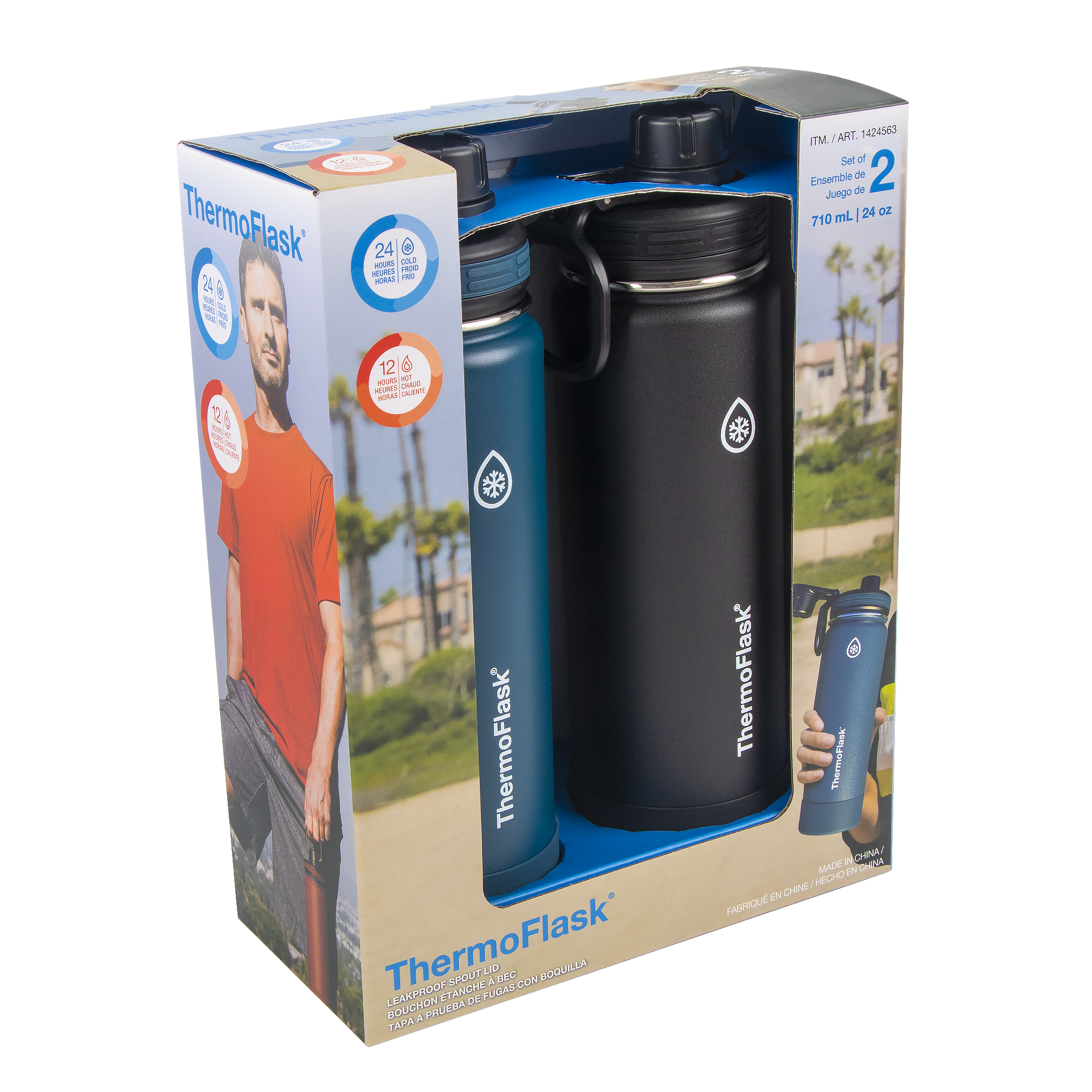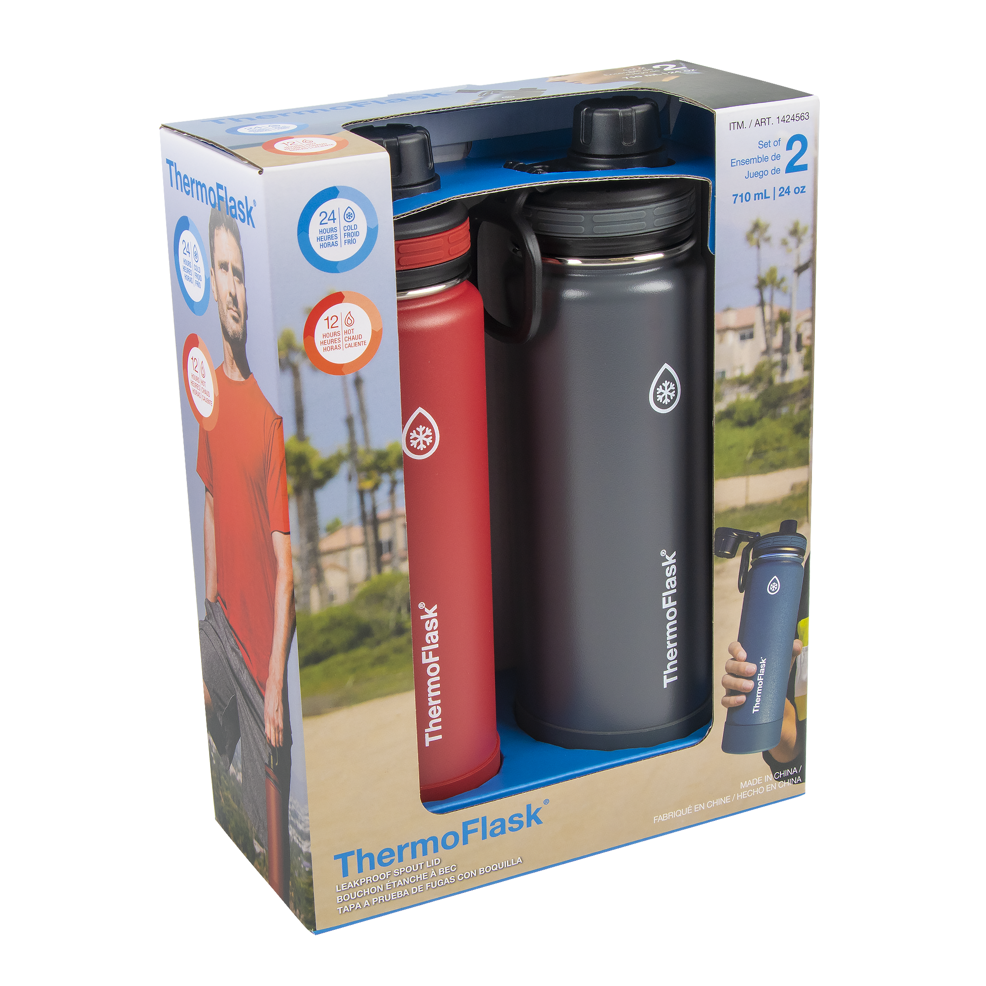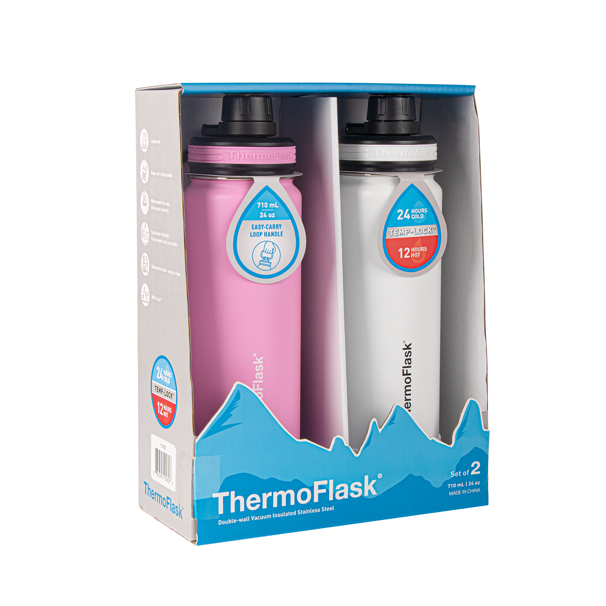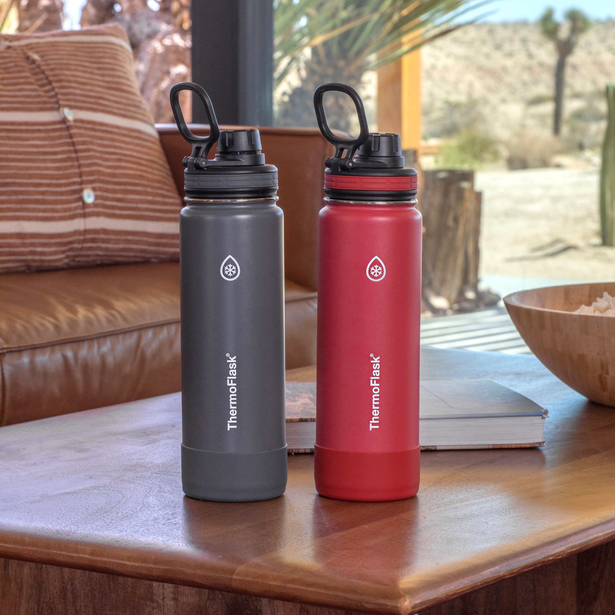 - Includes 2 x 24oz/0.71L ThermoFlask® Insulated Stainless Steel Water Bottles with Spout Lid