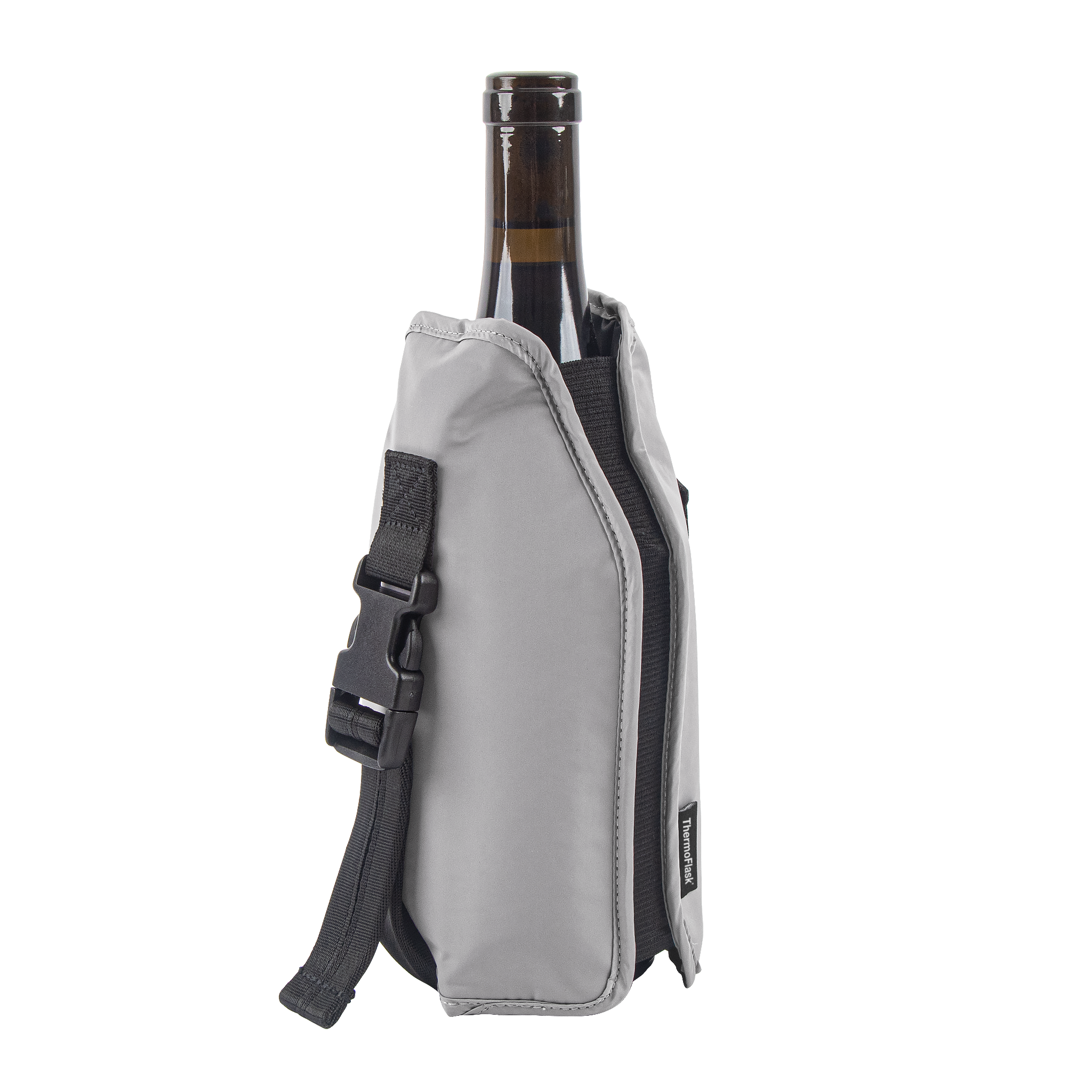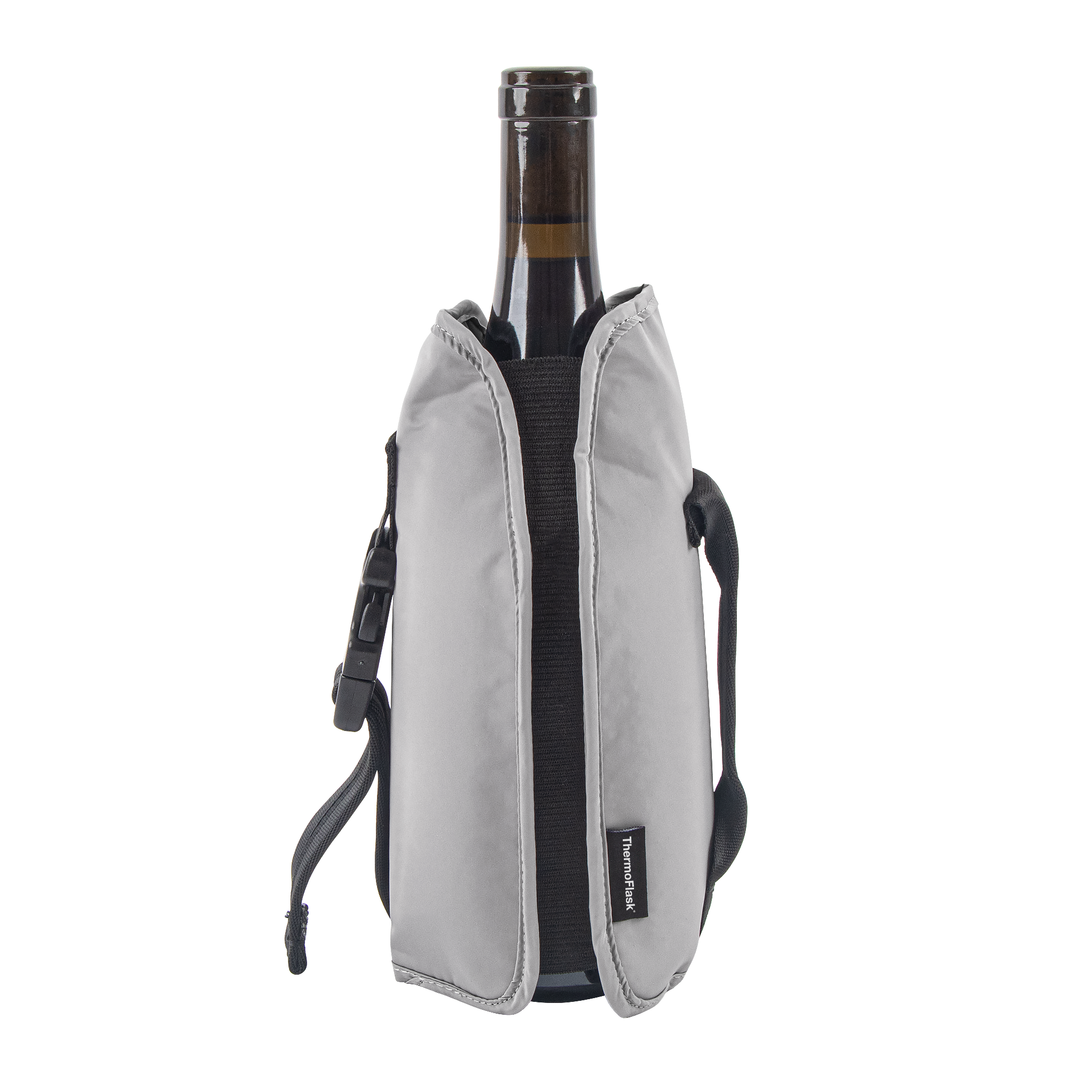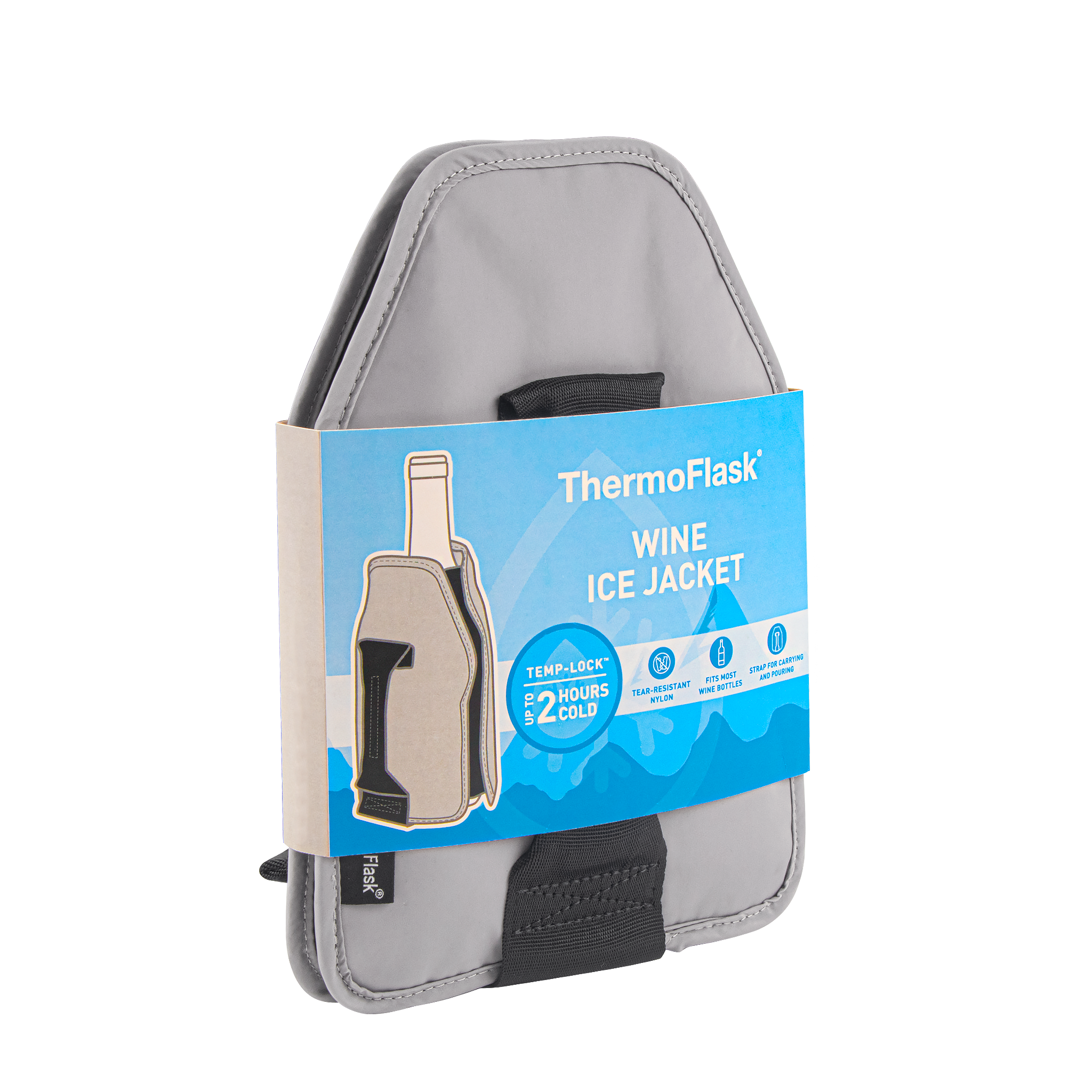 A modern twist on the bulky ice bucket. ThermoFlask’s Wine Bottle Ice Jacket locks in a frosty chill for up to 2 hours. so your favorite bottle of wine stays cool and crisp whether you’re lounging or adventuring. Light and portable. the stretchy collar fits most wine bottles on the inside and the durable nylon protects that sparkling goodness on the outside. We added an adjustable buckle for an extra snug fit. a side strap that double-duties for carrying and pouring. and a fold-flat design for slim storage—in your freezer!