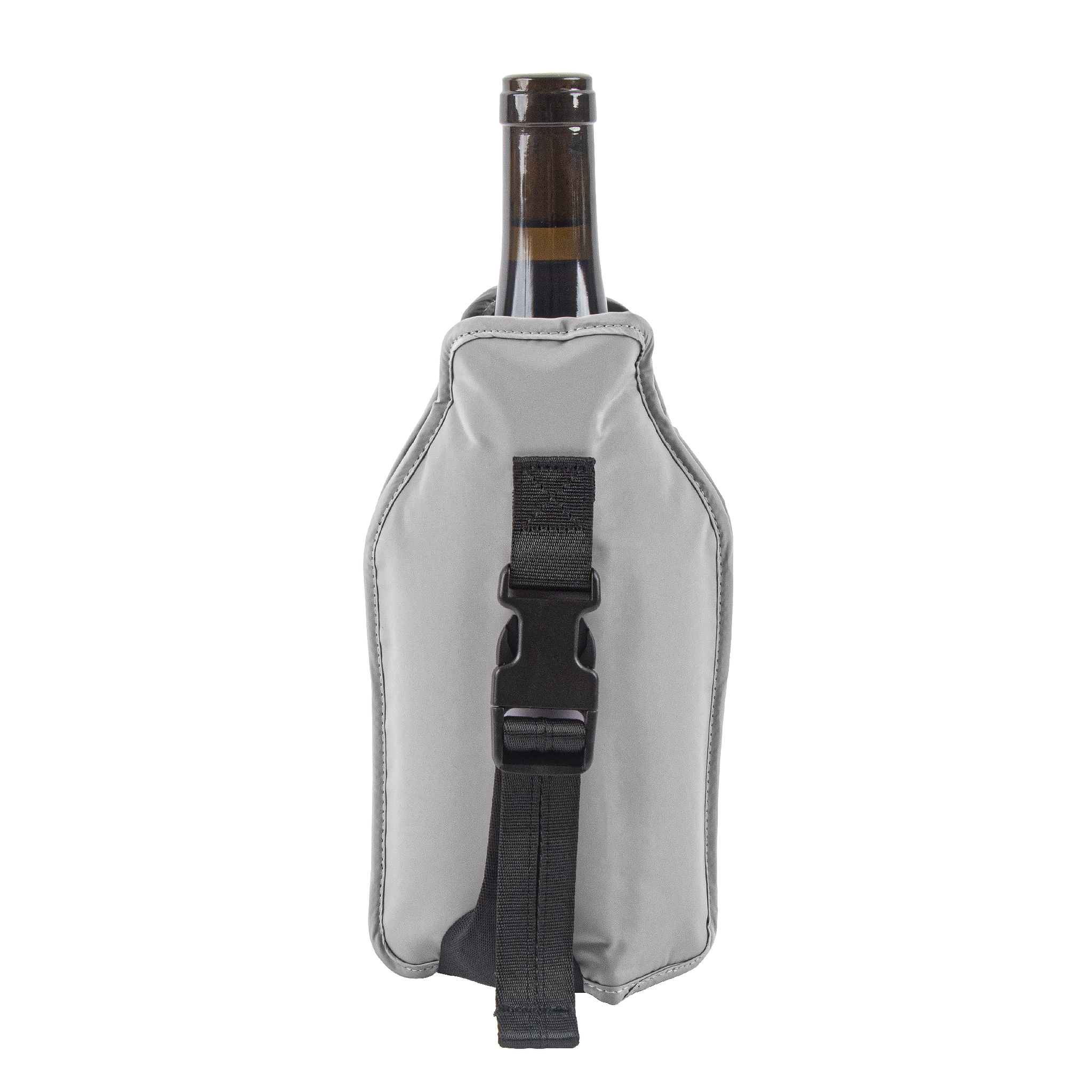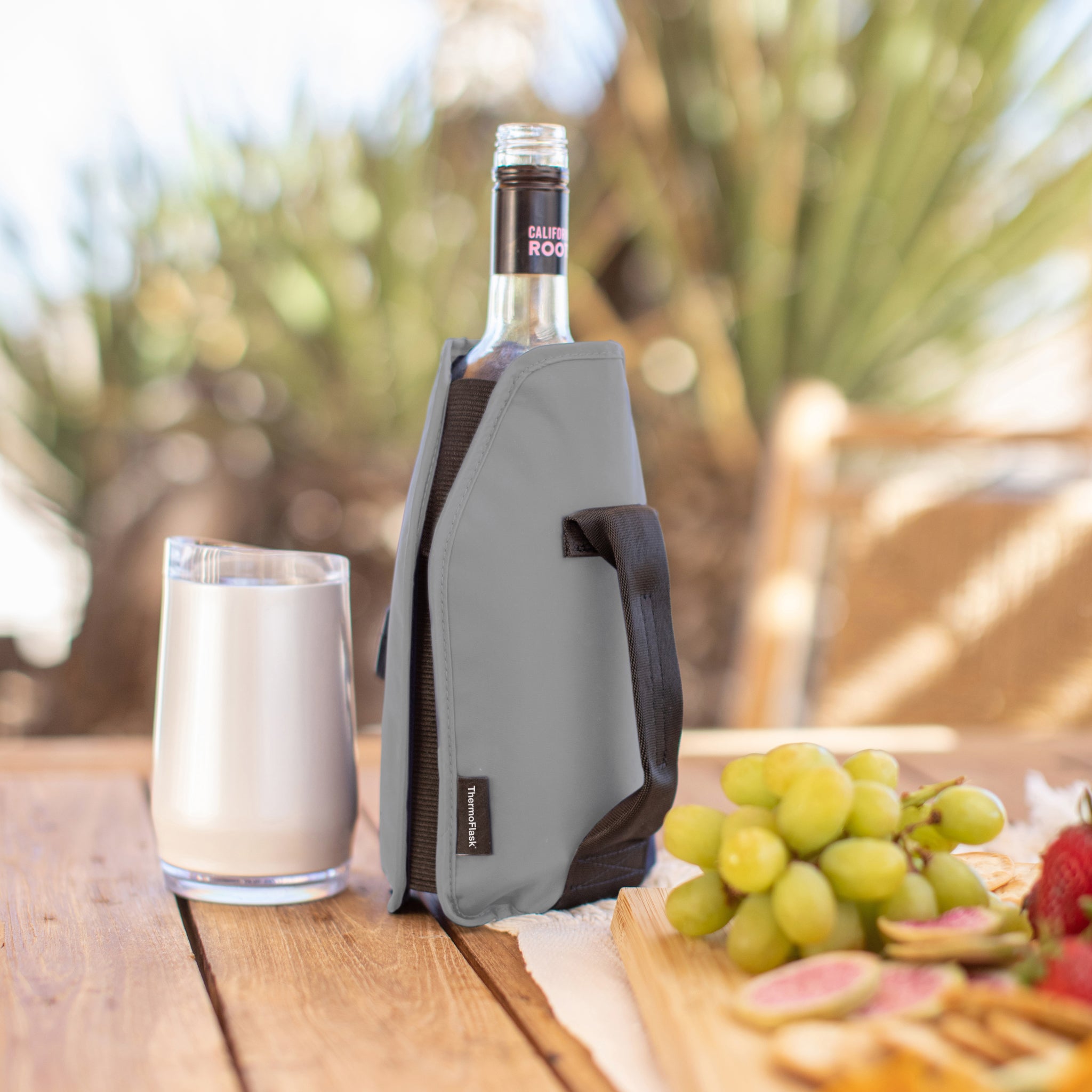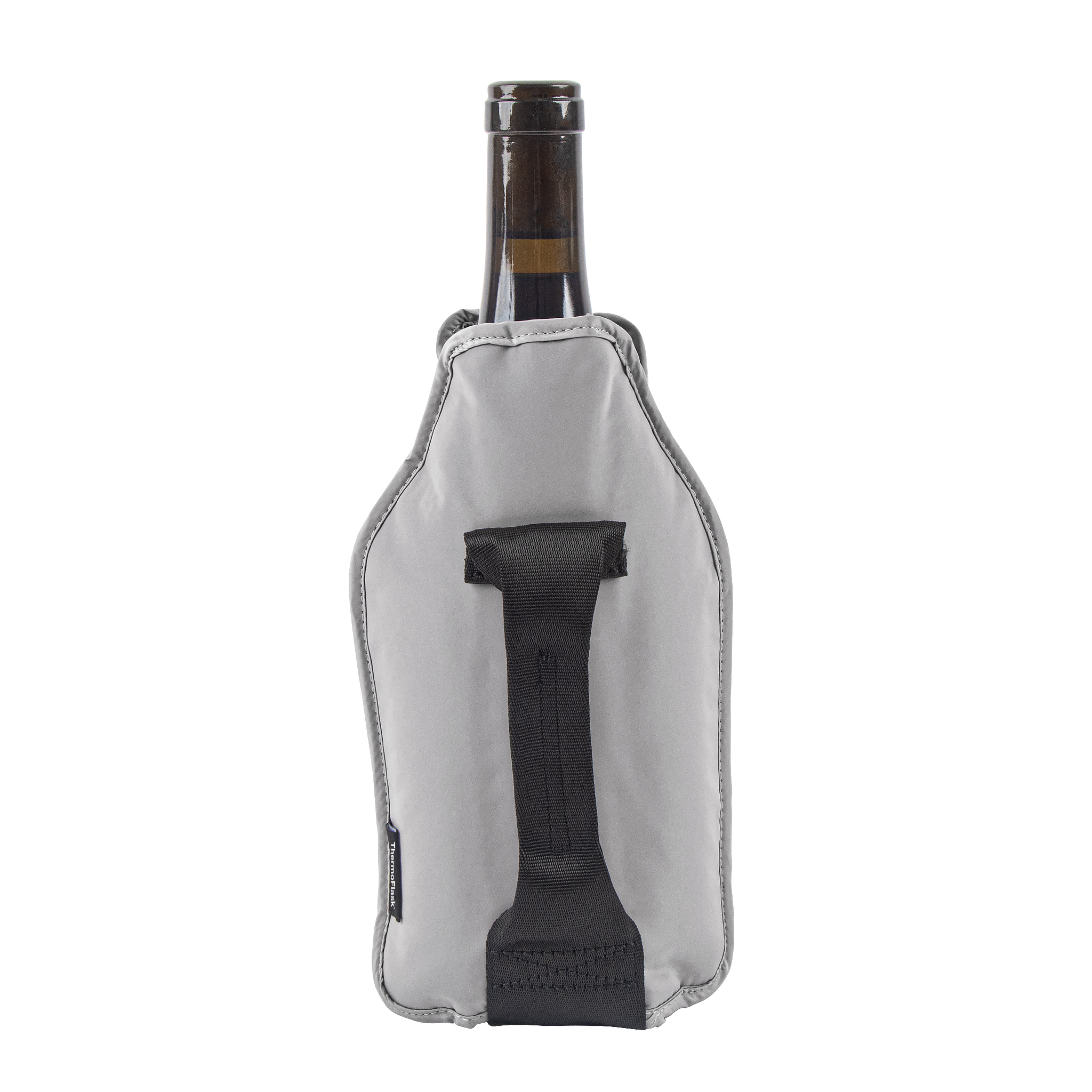 A modern twist on the bulky ice bucket. ThermoFlask’s Wine Bottle Ice Jacket locks in a frosty chill for up to 2 hours. so your favorite bottle of wine stays cool and crisp whether you’re lounging or adventuring. Light and portable. the stretchy collar fits most wine bottles on the inside and the durable nylon protects that sparkling goodness on the outside. We added an adjustable buckle for an extra snug fit. a side strap that double-duties for carrying and pouring. and a fold-flat design for slim storage—in your freezer!